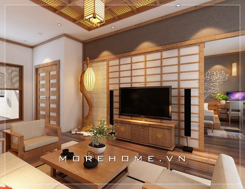 Thiết kế nội thất phòng khách chung cư đẹp, sang trọng với phong cách thiết kế Nhật Bản sử dụng chất liệu gỗ chủ đạo.
