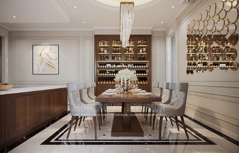 Trang trí nội thất phòng ăn phòng ăn tân cổ điển đẹp, quý phái với không gian bàn ăn dành cho 10 người nhưng vẫn rộng rãi thông thoáng.
