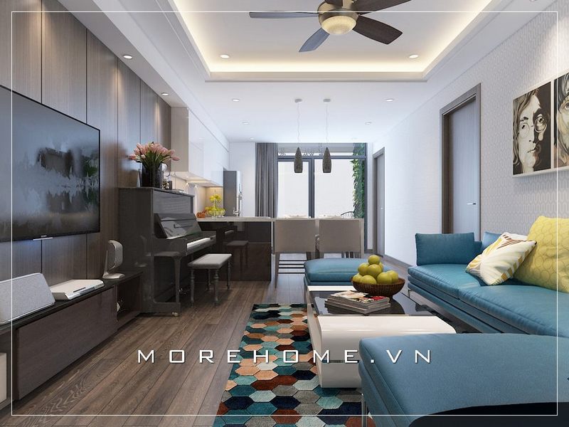 Sofa vải màu xanh trẻ trung là điểm nhấn nổi bật cho không gian phòng khách