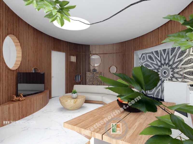 Trang trí phòng khách với nền sử dụng vật liệu đá nhân tạo màu trắng sang trọng kết hợp với tường phòng khách hệ vách gỗ bao quanh không gian hình Elip