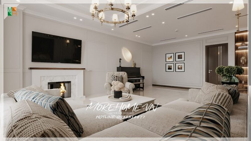 . Gia chủ đã lựa chọn bộ sofa óc bọc da cao cấp trong mẫu thiết kế này để đáp ứng nhu cầu tụ tập của gia đình đông thành viên trong những dịp cuối tuần, và cũng là một cách để thể hiện đẳng cấp của gia chủ.