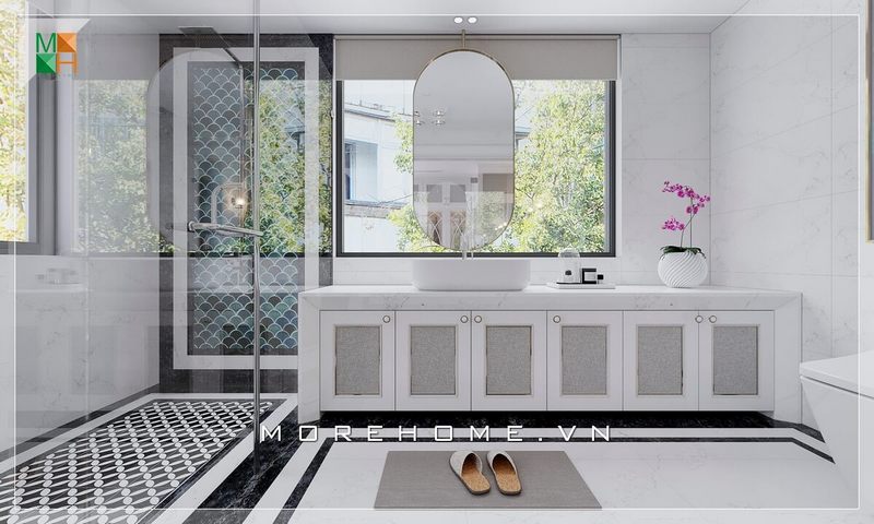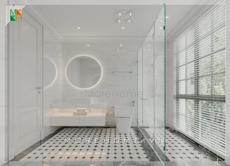 Mẫu thiết kế nội thất phòng tắm hiện đại được sử dụng chủ yếu tone màu trắng để tạo nên sự sang trọng và tinh tế cho các không gian nhà phố, biệt thự, chung cư.